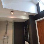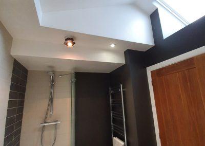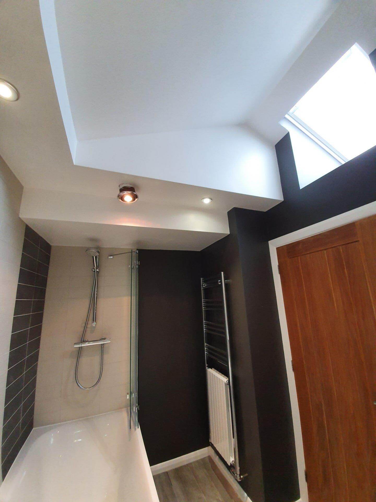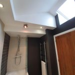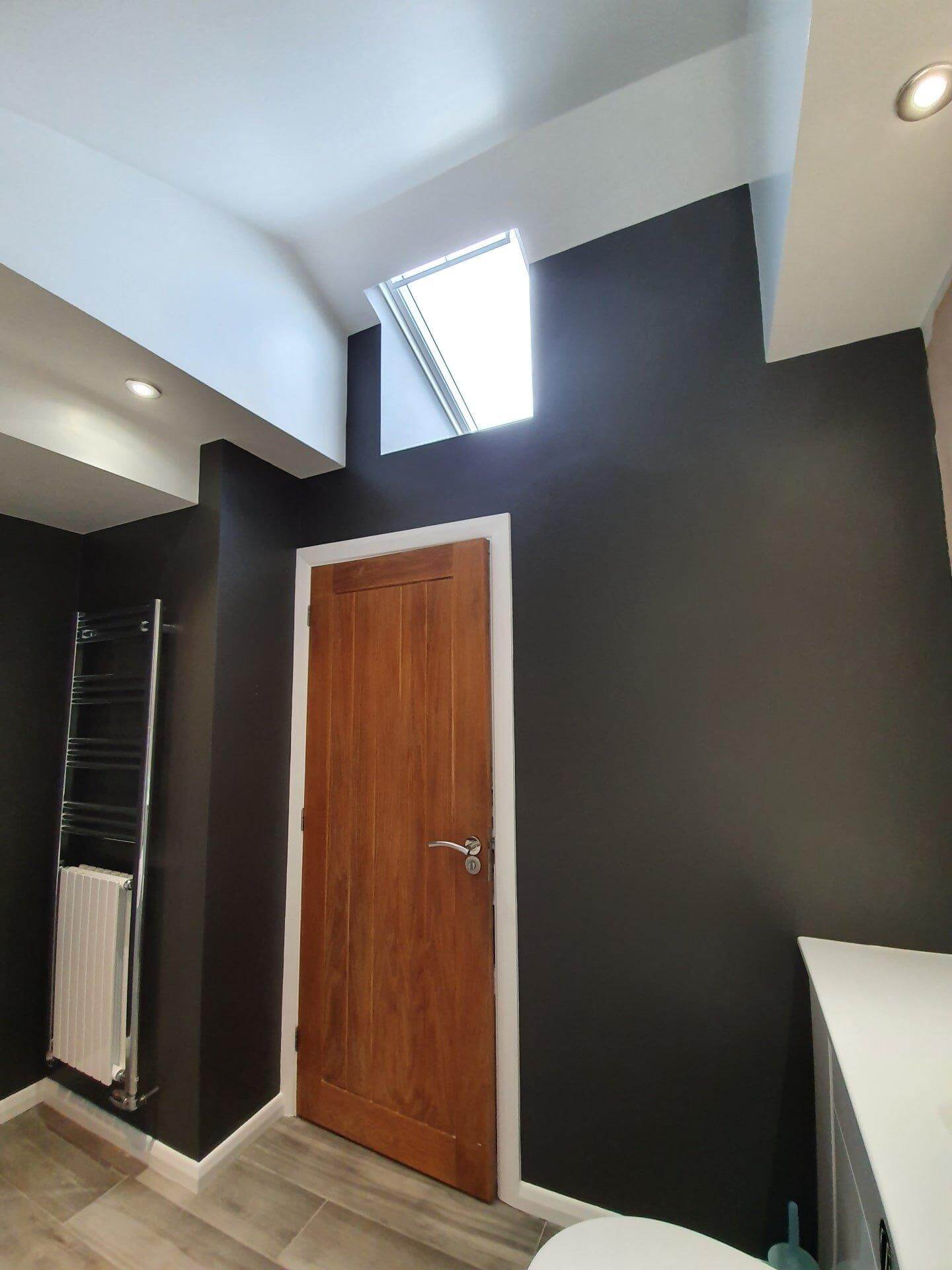 Bathroom paint must be specially formulated to resist moisture and protect against mould in high condensation and humidity areas. Higher sheen paints like eggshell tend to do a better job of repelling moisture and debris than do flatter sheen. This black and white bathroom used a higher sheen, light reflective eggshell paint