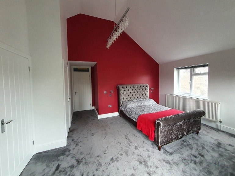 This bold red bedroom has a feature wall painted with Johnstone’s trade acrylic durable matt, a premium quality matt emulsion which was colour matched to Farrow and Ball”s Rectory Red, a rich, warming, sophisticated red.